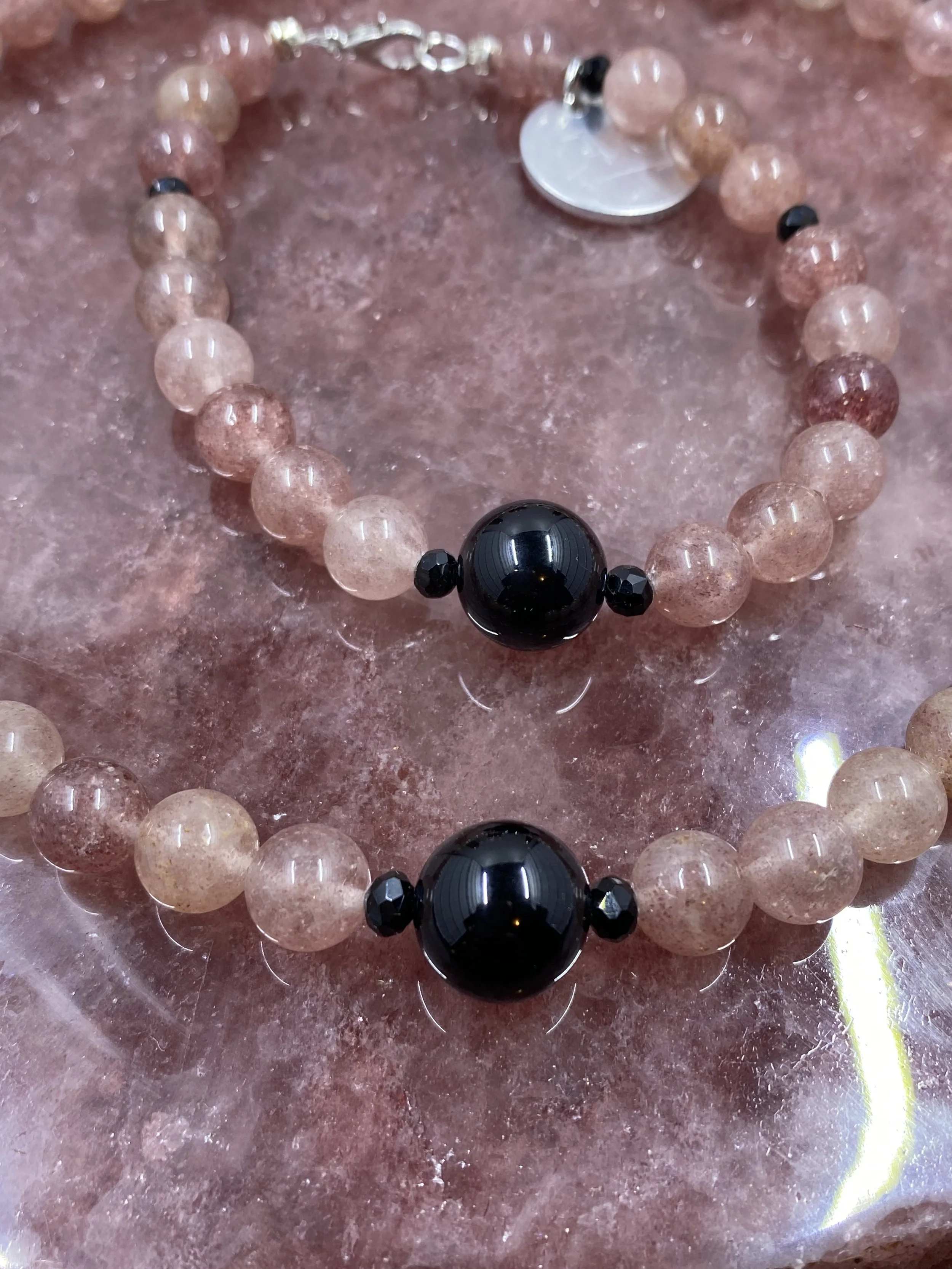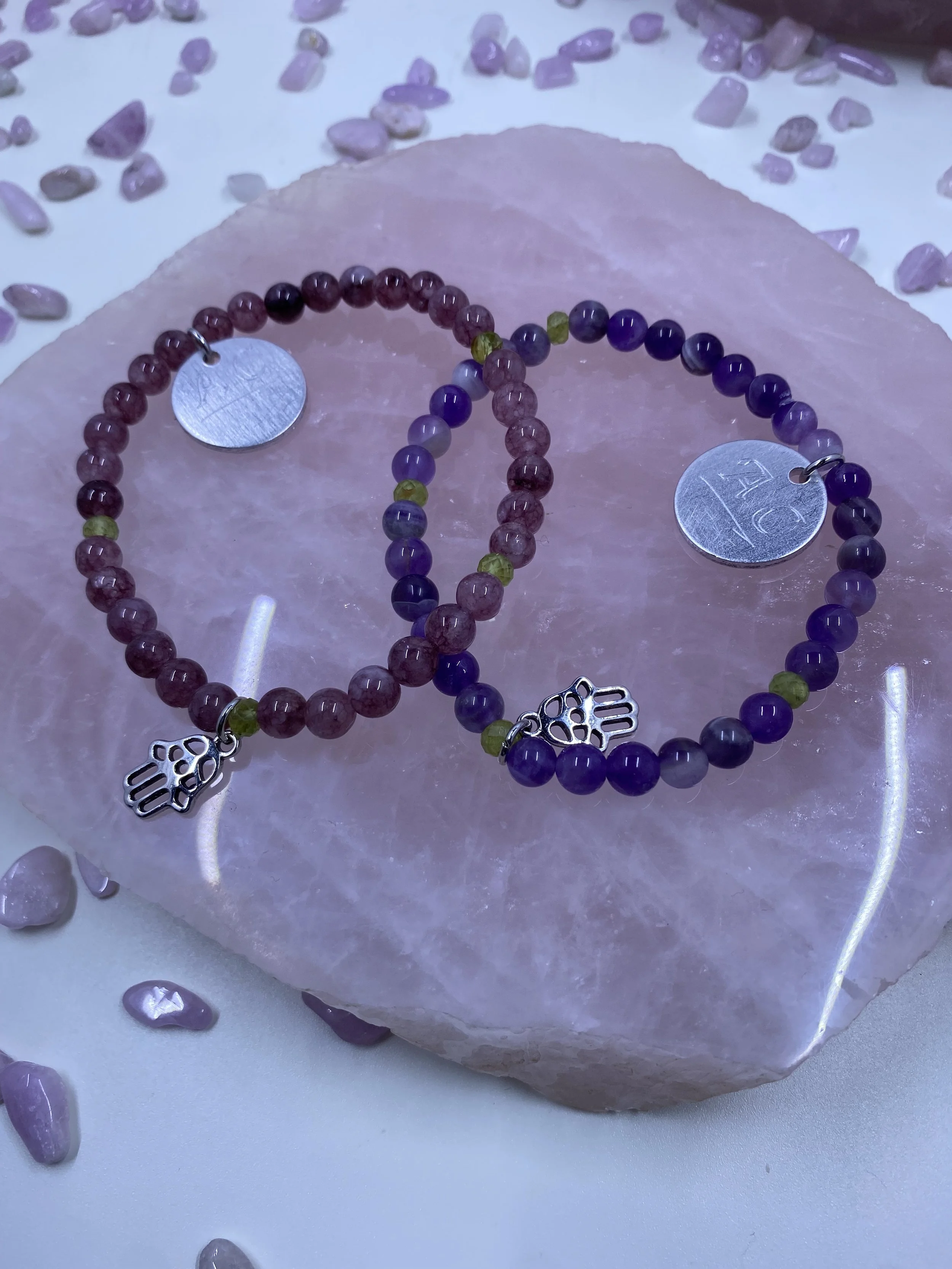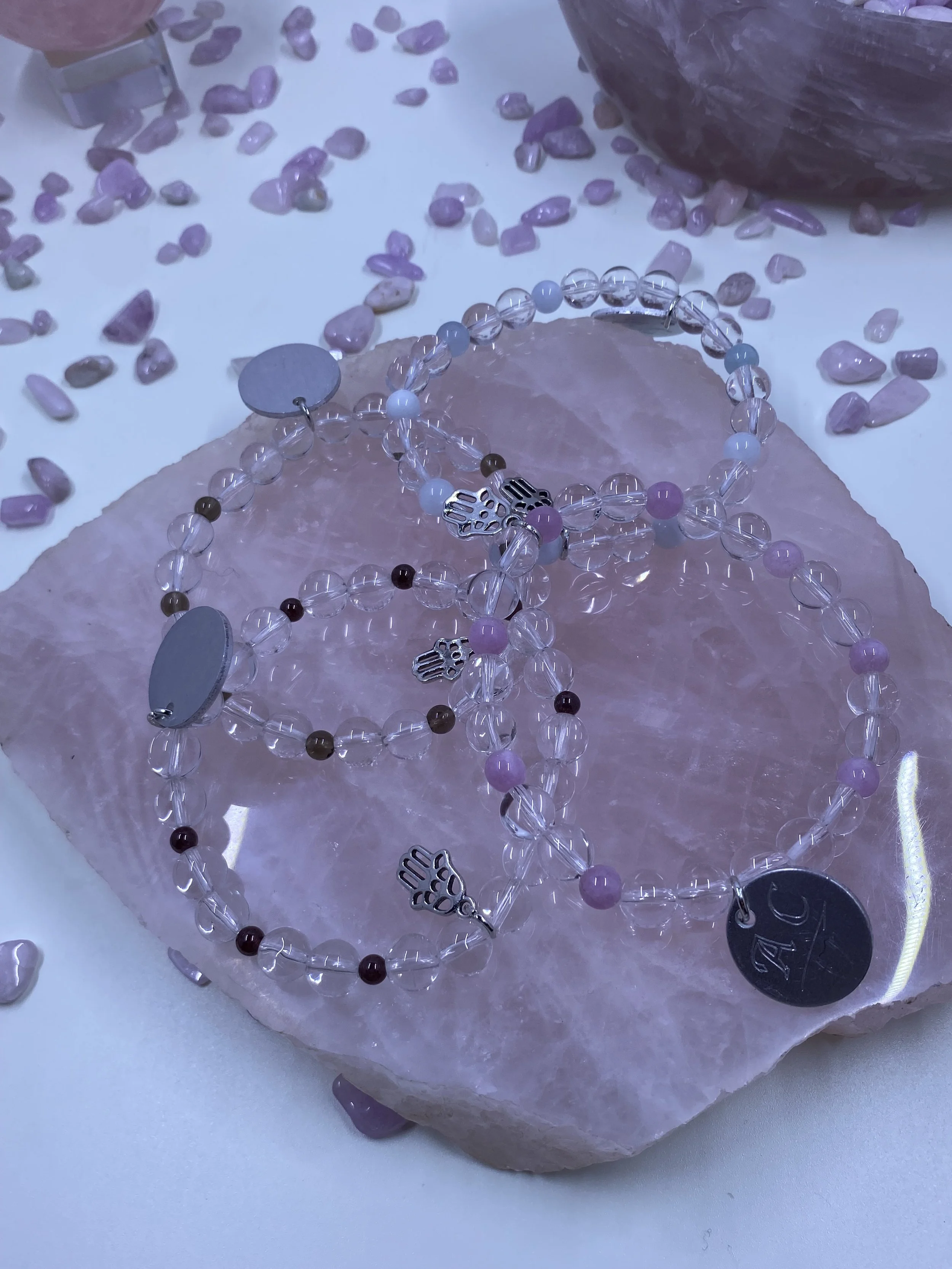 ➰Stones; Howlite, Opalite, Grey Moonstonel, Strawberry Quartz, Clear Quartz, Green Angelite, Blue Angelite and Mother of Pear (MOP is smaller beads)
